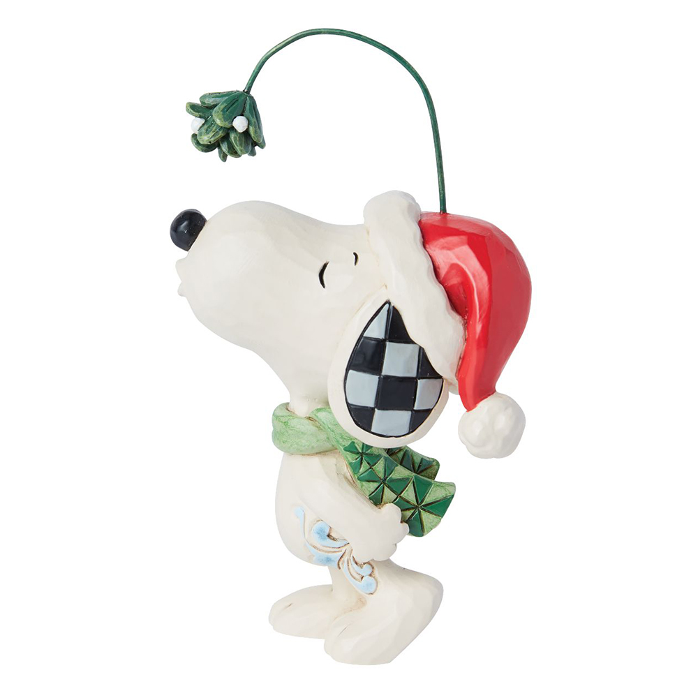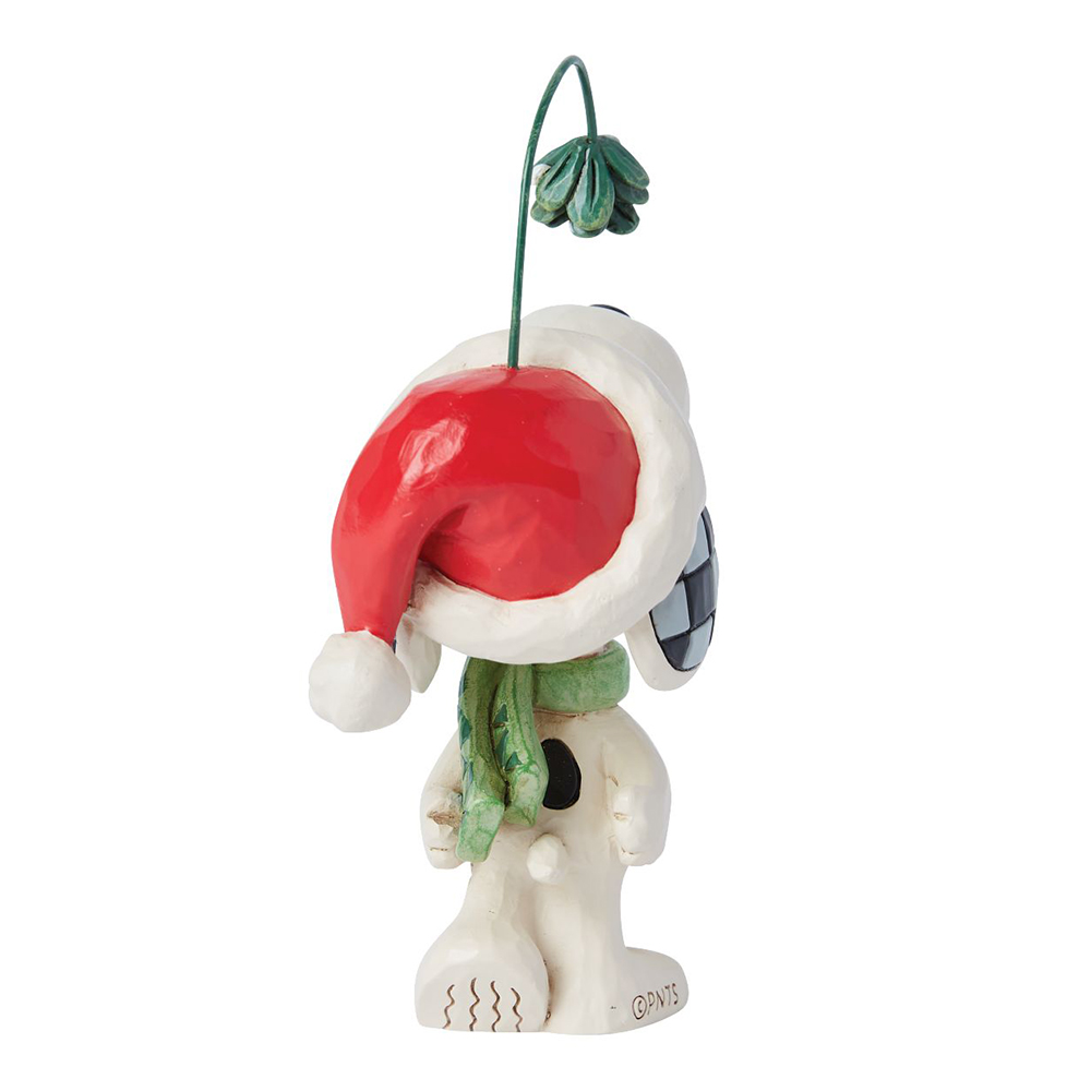スヌーピーが被っているサンタ帽から伸びているのは常緑樹のヤドリギ。昔から「ヤドリギの木の下でキスをするとその愛は永遠に守られる」と言われています。ヤドリギを頭につけてキスのポーズをするユニークなスヌーピーです。