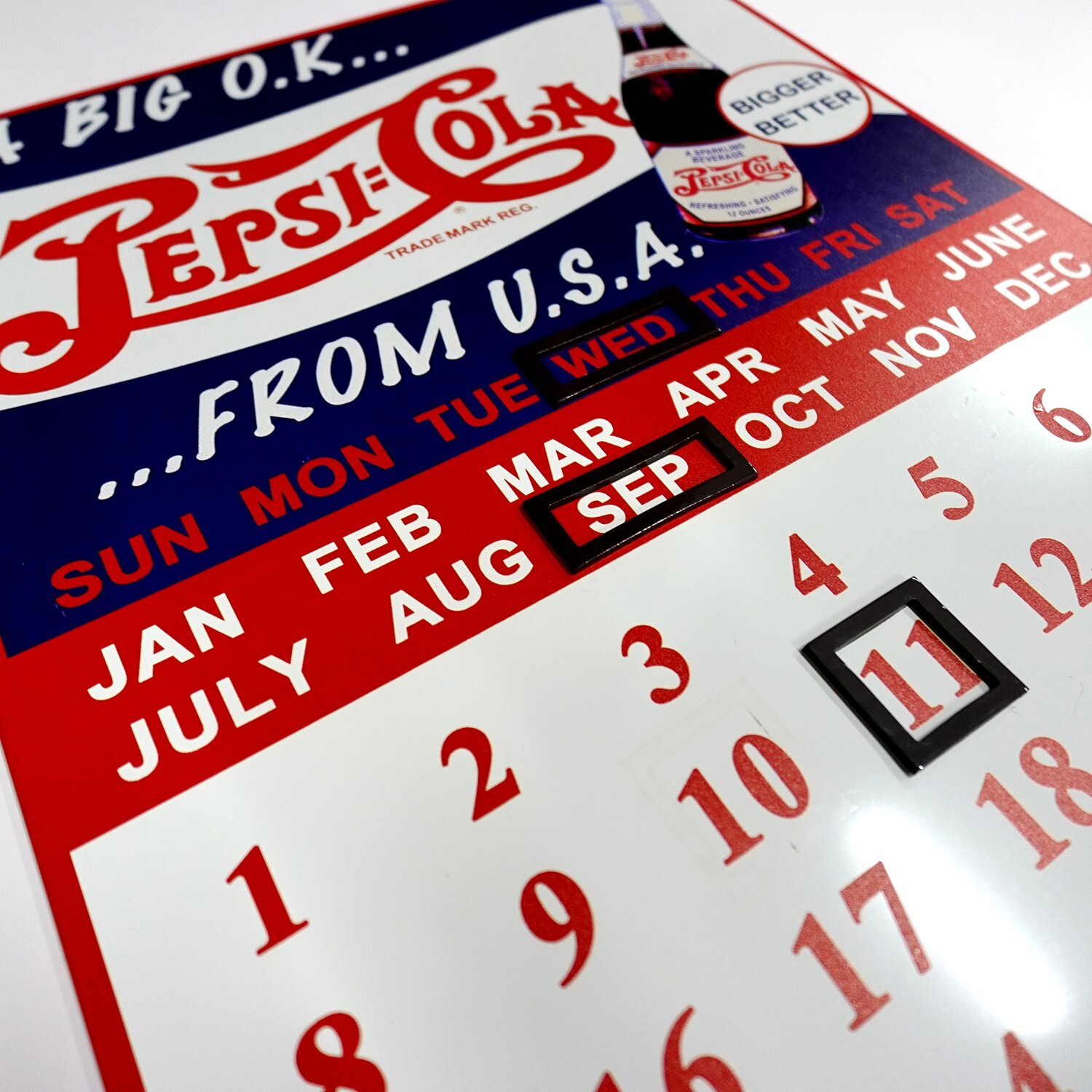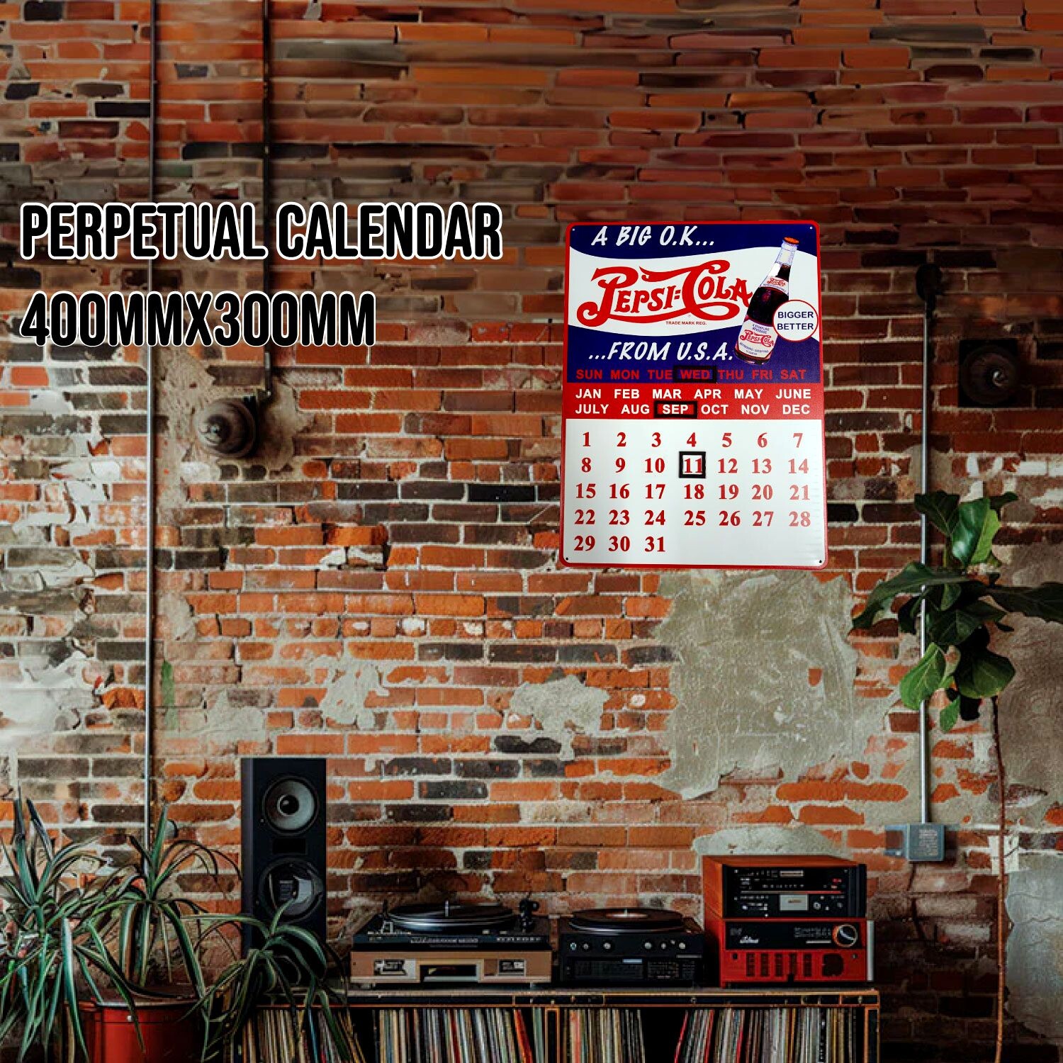 12月31日で終わるカレンダーでは無く、永久的に使えれる万年カレンダーです。曜日、月、日を囲むマグネットプレートが付いています。1日ごとにマグネットを移動する事で永久的に使えます。日付を移動するのが疲れちゃったと思っても、メタルサインとして飾っておくだけでもインテリアとしてアメリカンな雰囲気を演出します。