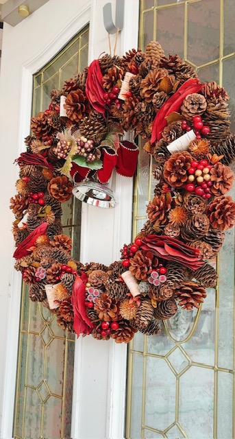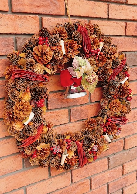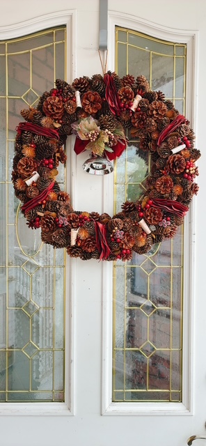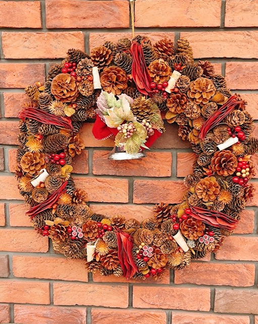 松ぼっくりや木の実、深みのある赤系のリボンなど、ナチュラル素材を贅沢に使い落ち着いた高級感と温かみを演出します。