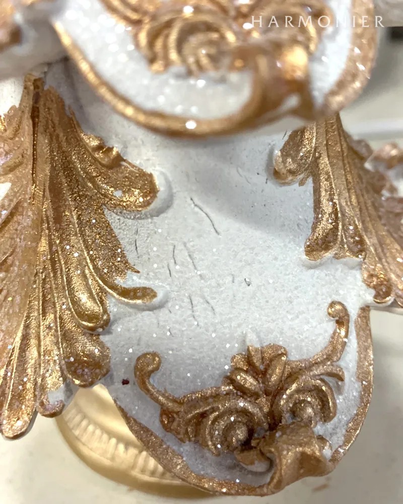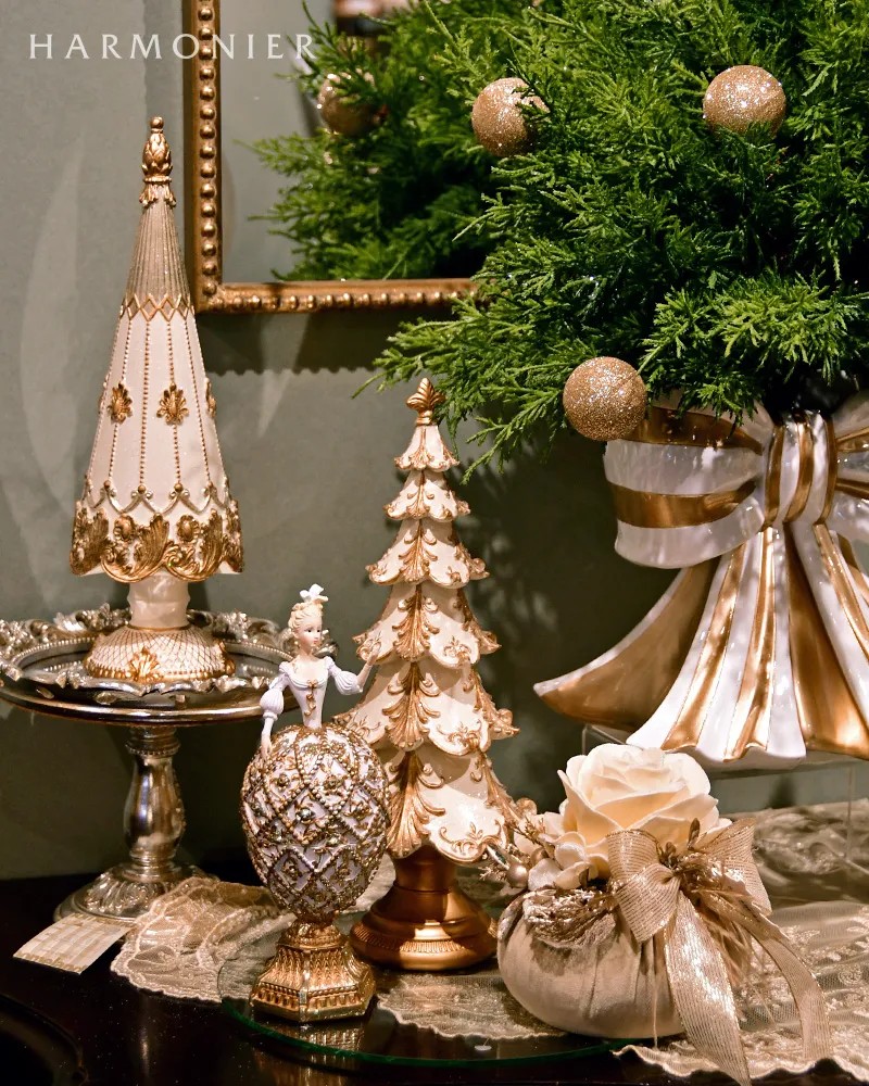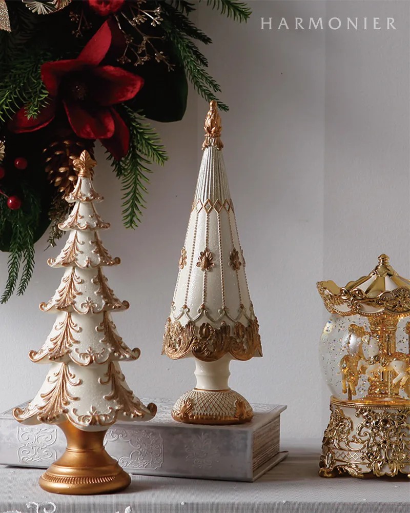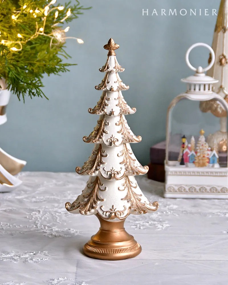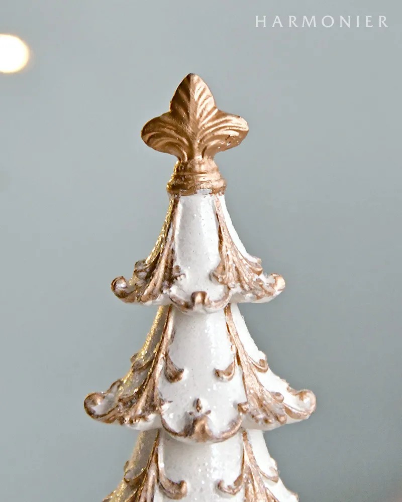 クラシカルなデコレーションの高級感のあるクリスマスツリーオブジェ。ホワイトとゴールドのカラーリングが上品で洗練された印象です。高さ30cmほどで棚上に飾ると存在感があり、空間を華やかにしてくれます。トナカイやサンタクロースのオブジェと合わせて飾ると素敵です。