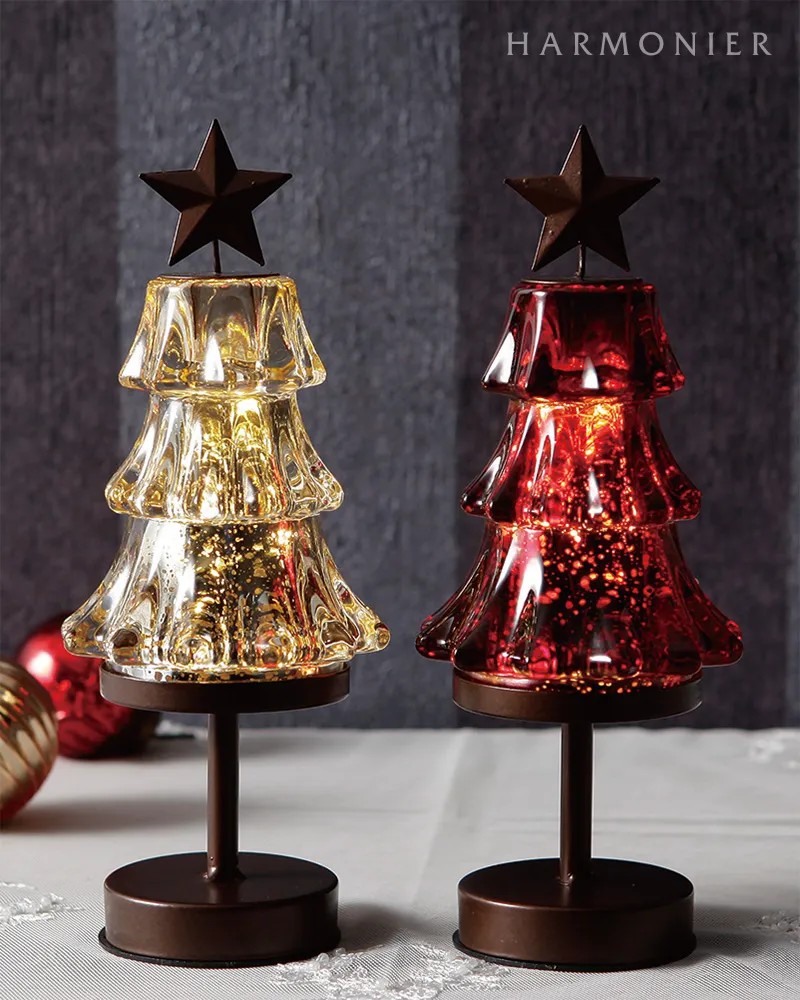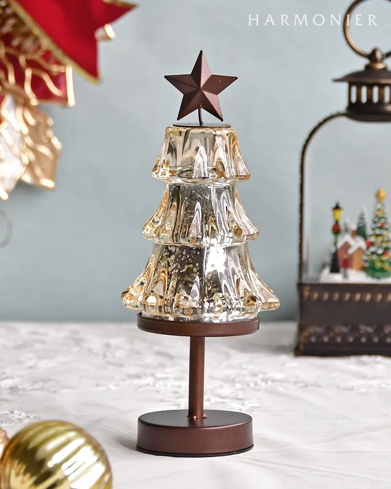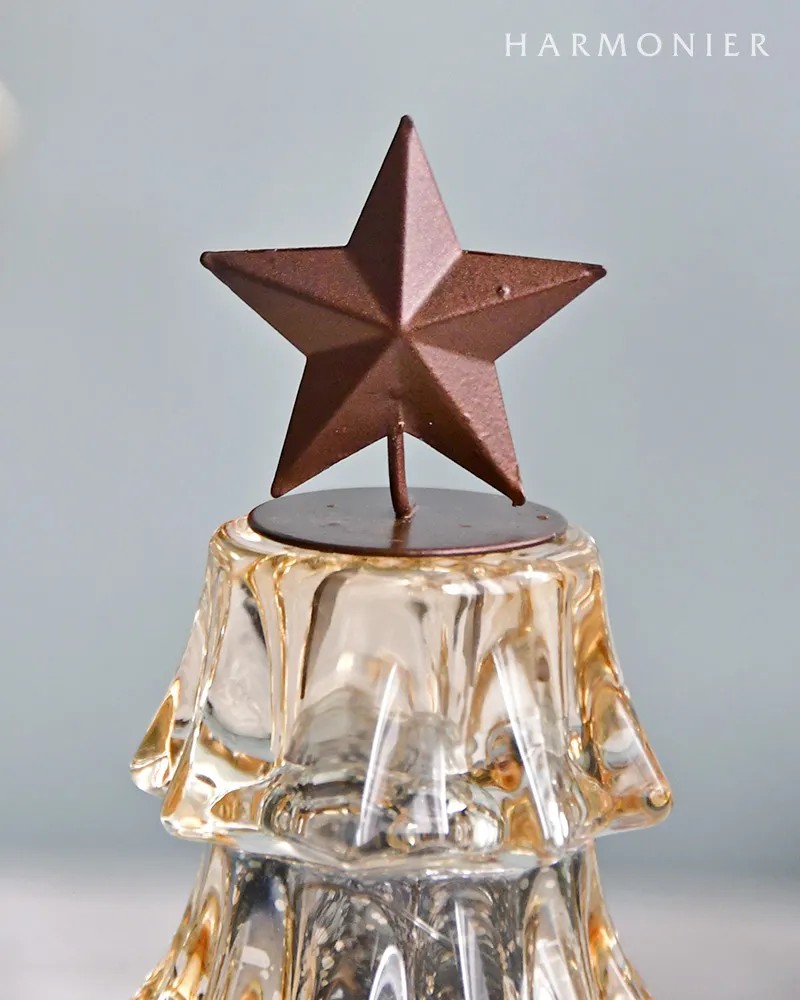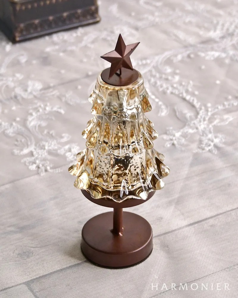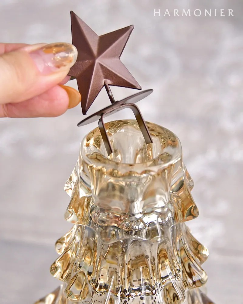 アンティーク調にペイントを施したガラスツリーに、アイアンの星とスタンドを合わせたヴィンテージ感のあるLEDライト付きのツリーオブジェ。アンティーク家具やヴィンテージインテリアにも馴染み、上品なシャンパンカラーはクリスマス装飾のアクセントになります。トップを外してテーパーキャンドルホルダーとしても使えるので、テーブルデコレーションにもおすすめです。
