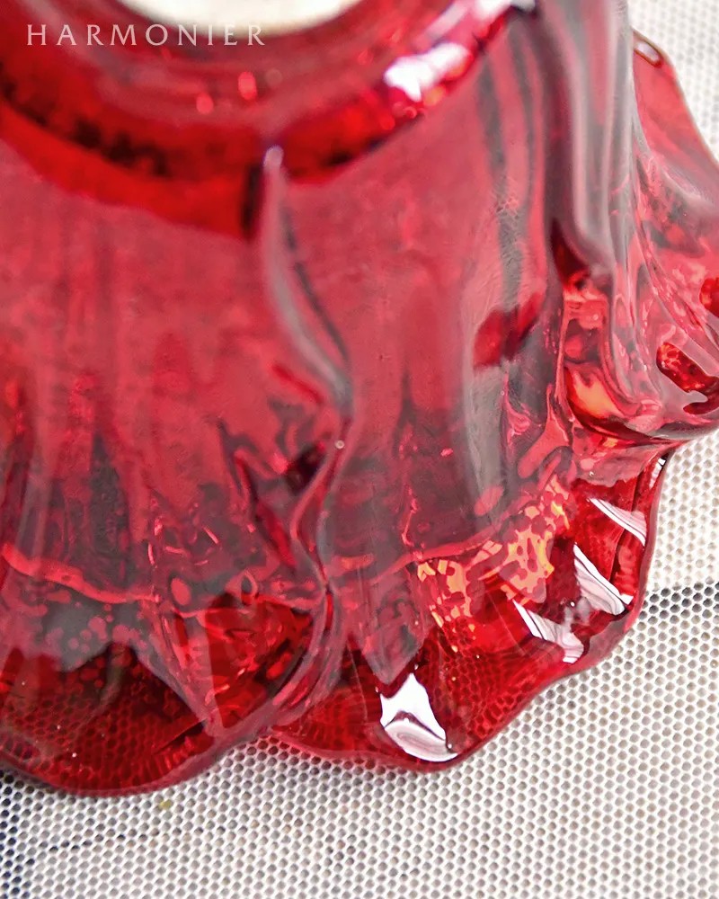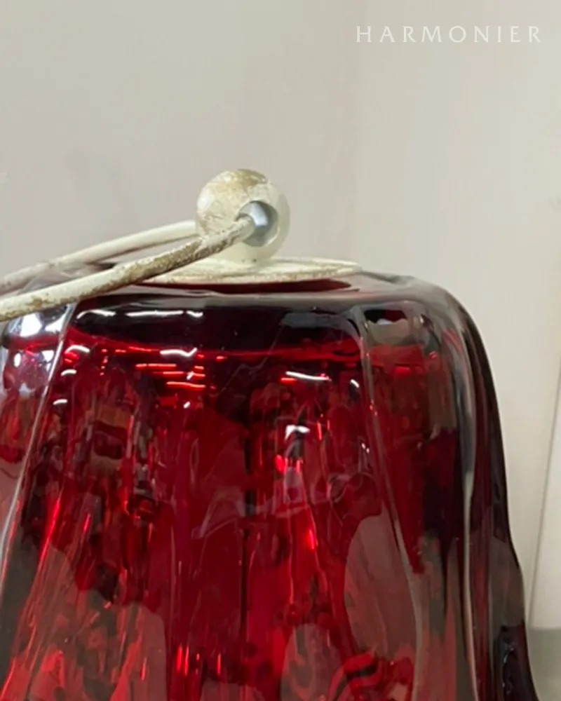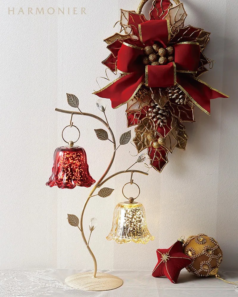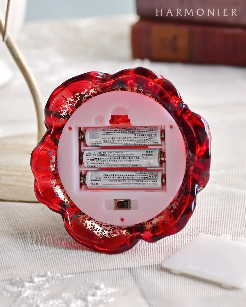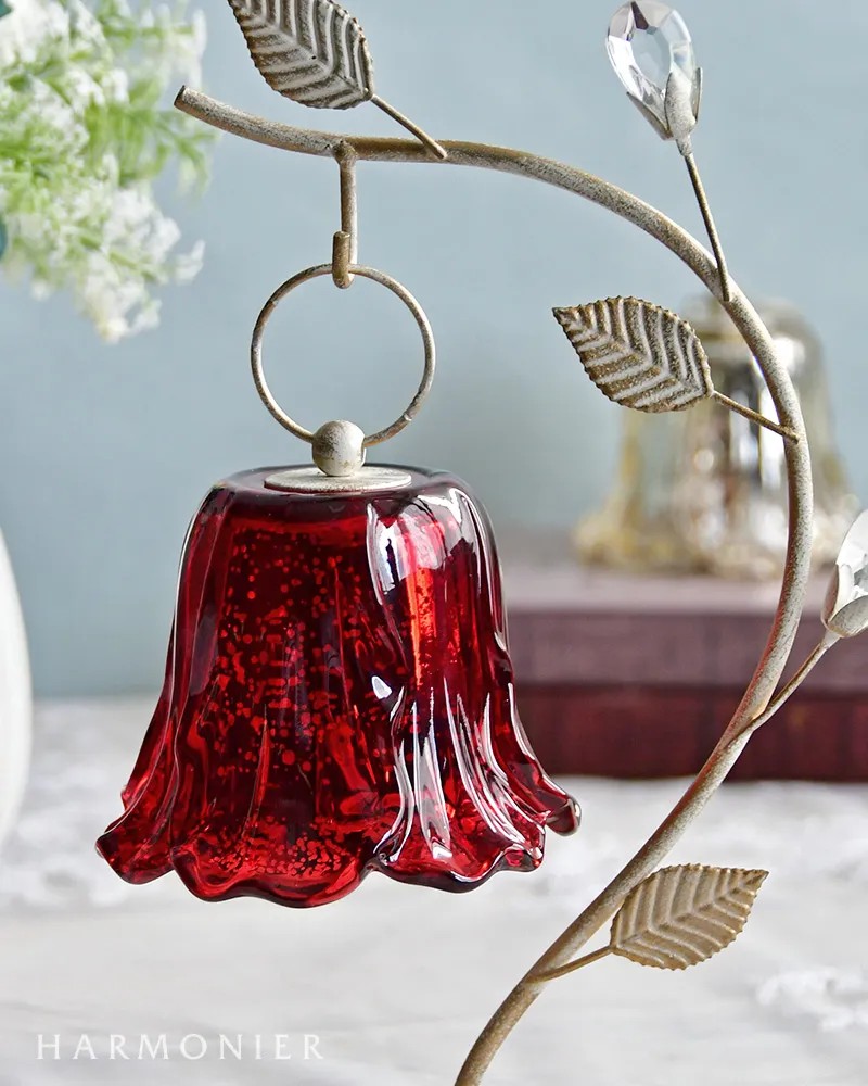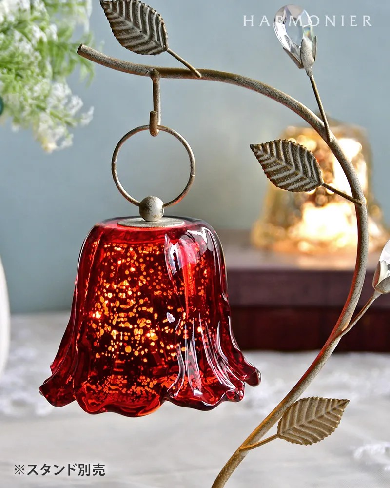 おしゃれなチューリップ型の電池式ハンギングランプ。シックな赤色のガラスに、アンティーク調のペイント加工を施しており、かわいらしくも高級感のある印象。クラシカルなインテリアにもおすすめです。同シリーズのリーフスタンドと合わせて1灯でも2灯でも楽しめます。