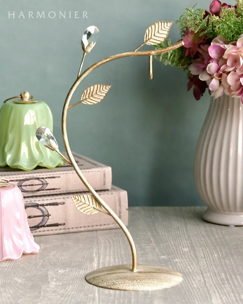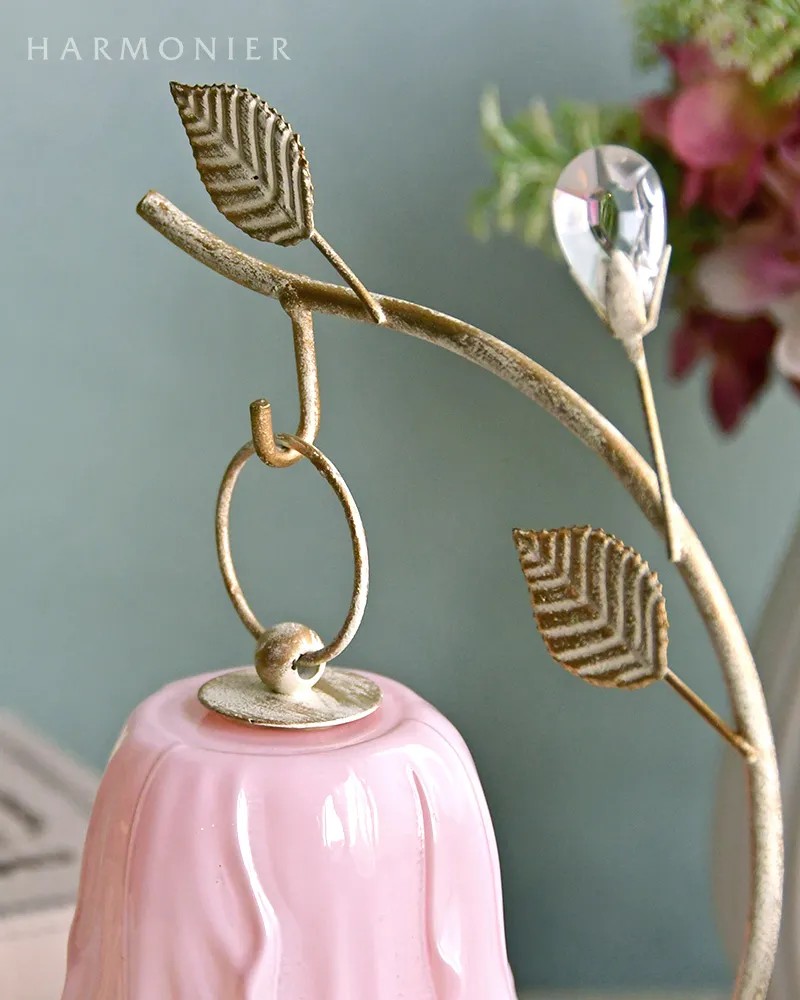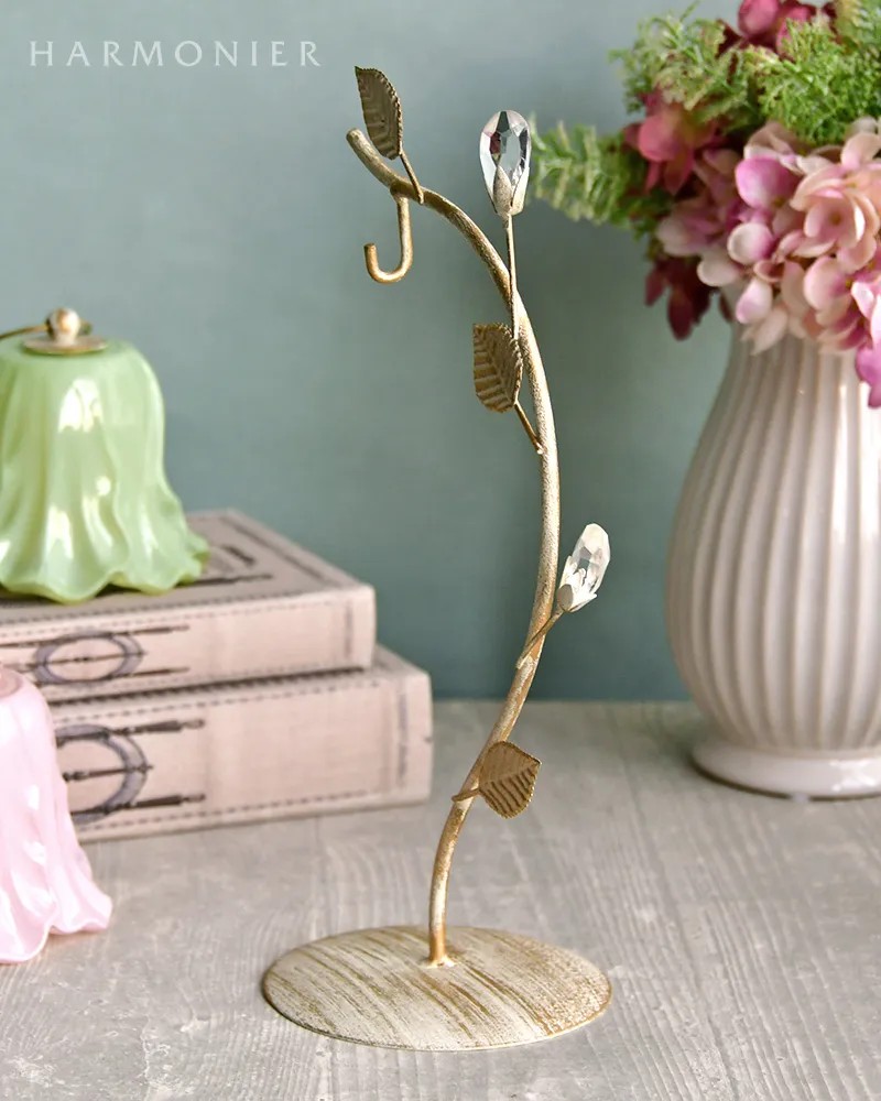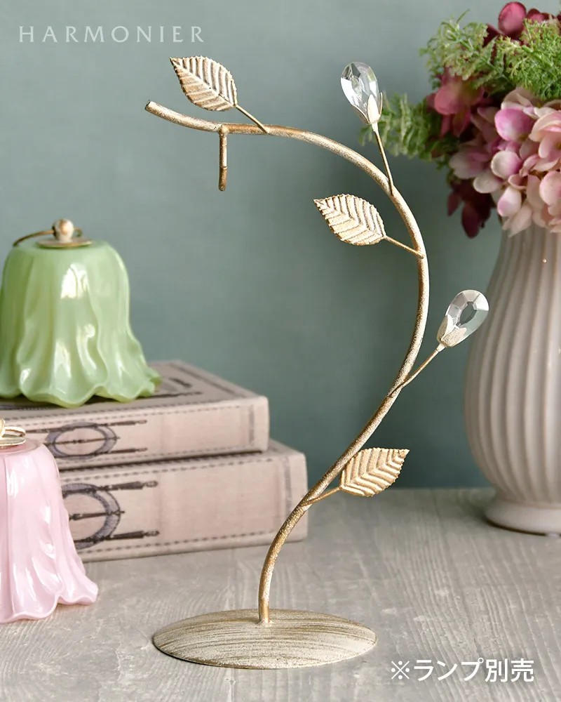 シャビーシックに仕上げたおしゃれなリーフ付きのランプスタンド。優美な曲線にクリアストーンのベリーやリーフを装飾したおしゃれなデザイン。チューリップ型のLEDランプと合わせれば、玄関やリビングのかわいいアクセントに。その他のランプやオーナメントなどを飾っても素敵です。