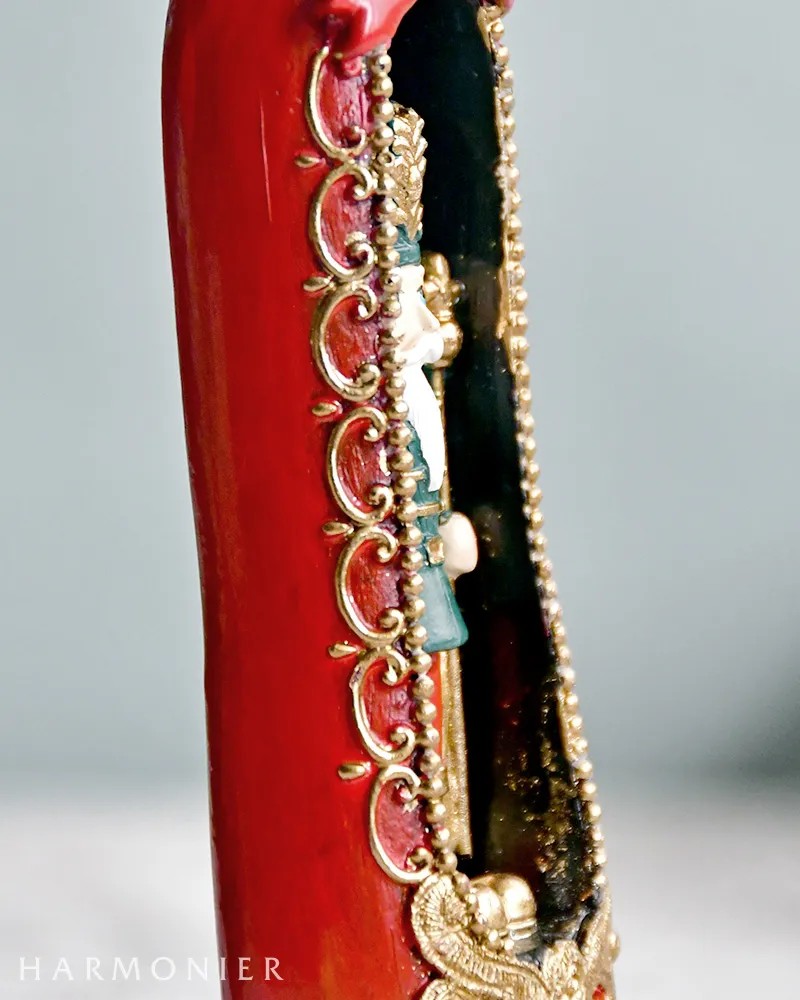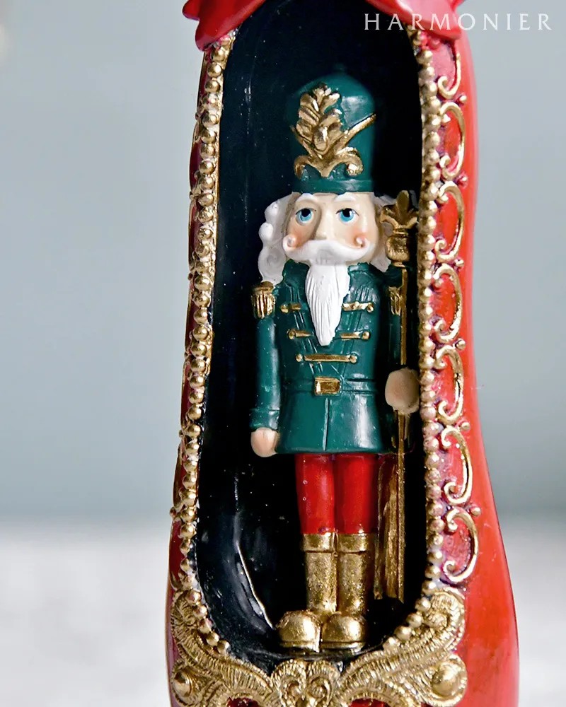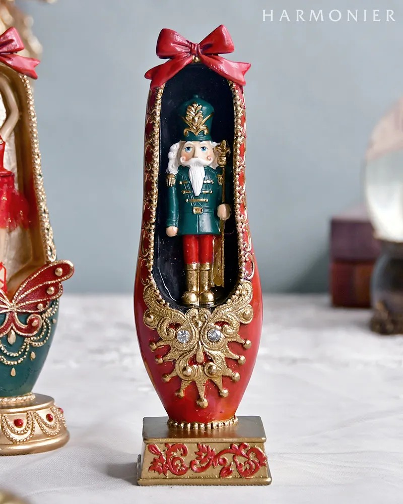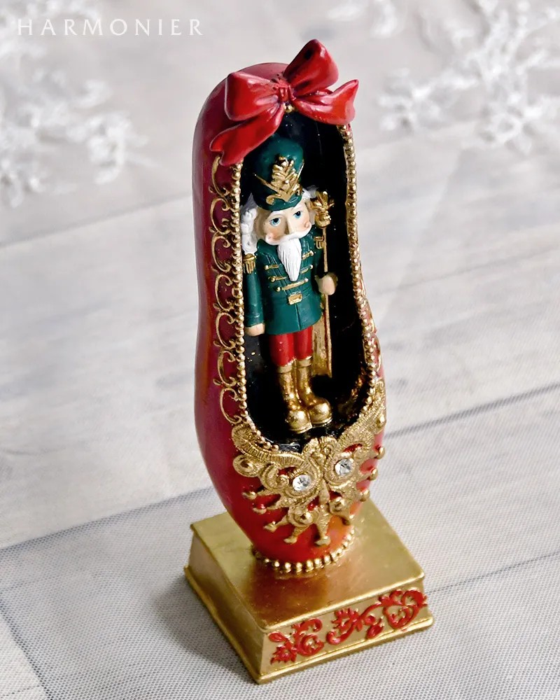 クラシカルで重厚感のあるおしゃれなバレエシューズのオブジェ。中にはバレリーナとソルジャーが入っています。シックなクリスマスカラーにリボンやバロック調のデコレーションが華やかで高級感のある印象です。