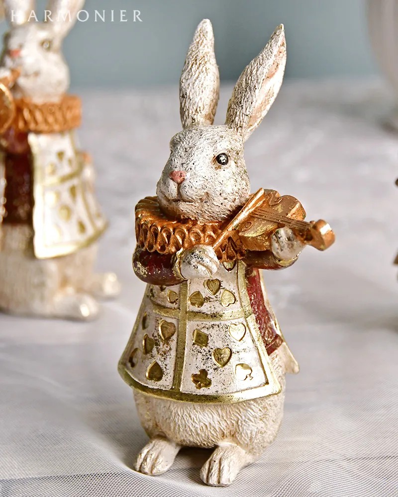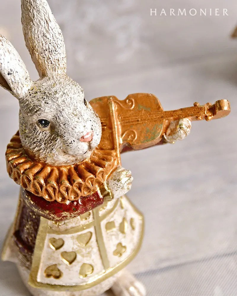 アンティーク調のおしゃれなトランプ柄の衣装を着たミニウサギのかわいいオブジェ。手には楽器やティーカップを持っていて今にも動き出しそうなキュートな姿。書棚やシューズボックス上などに飾りやすいコンパクトなサイズで、3種並べて飾るのがおすすめです。毛並みや衣装の細部まで丁寧に作られた高級感のある仕上がりで、クラシカルなインテリアやアンティーク家具にも馴染みます。