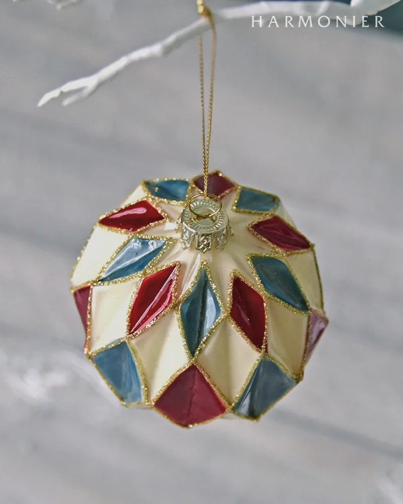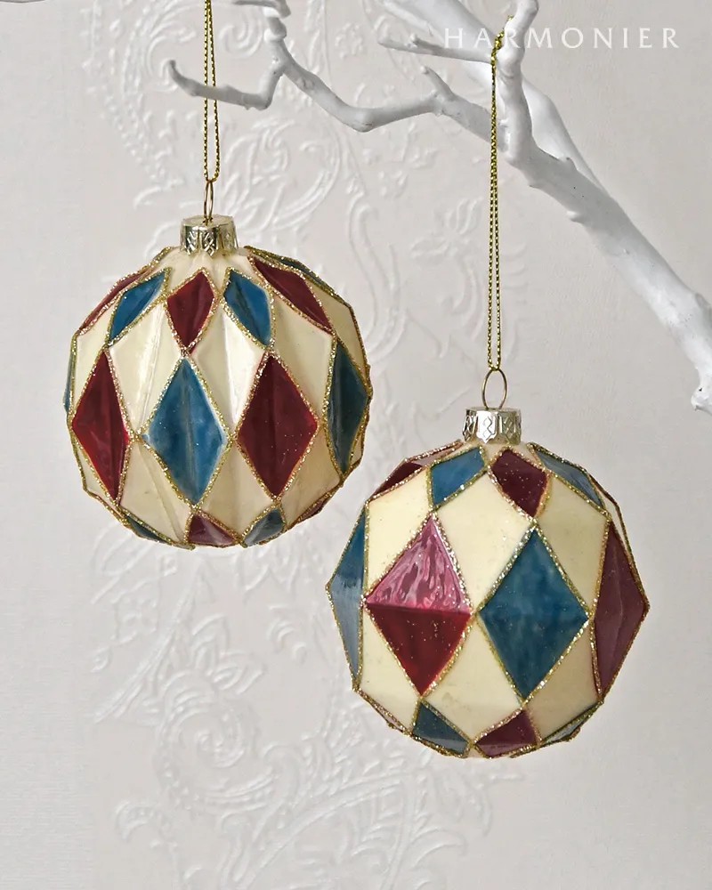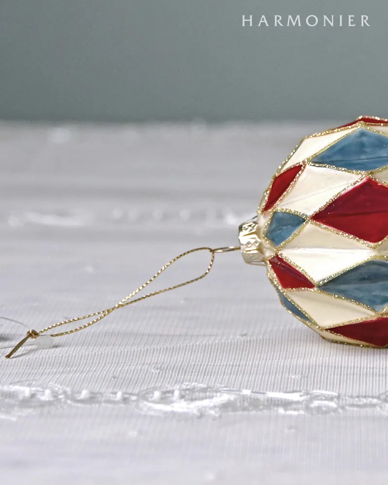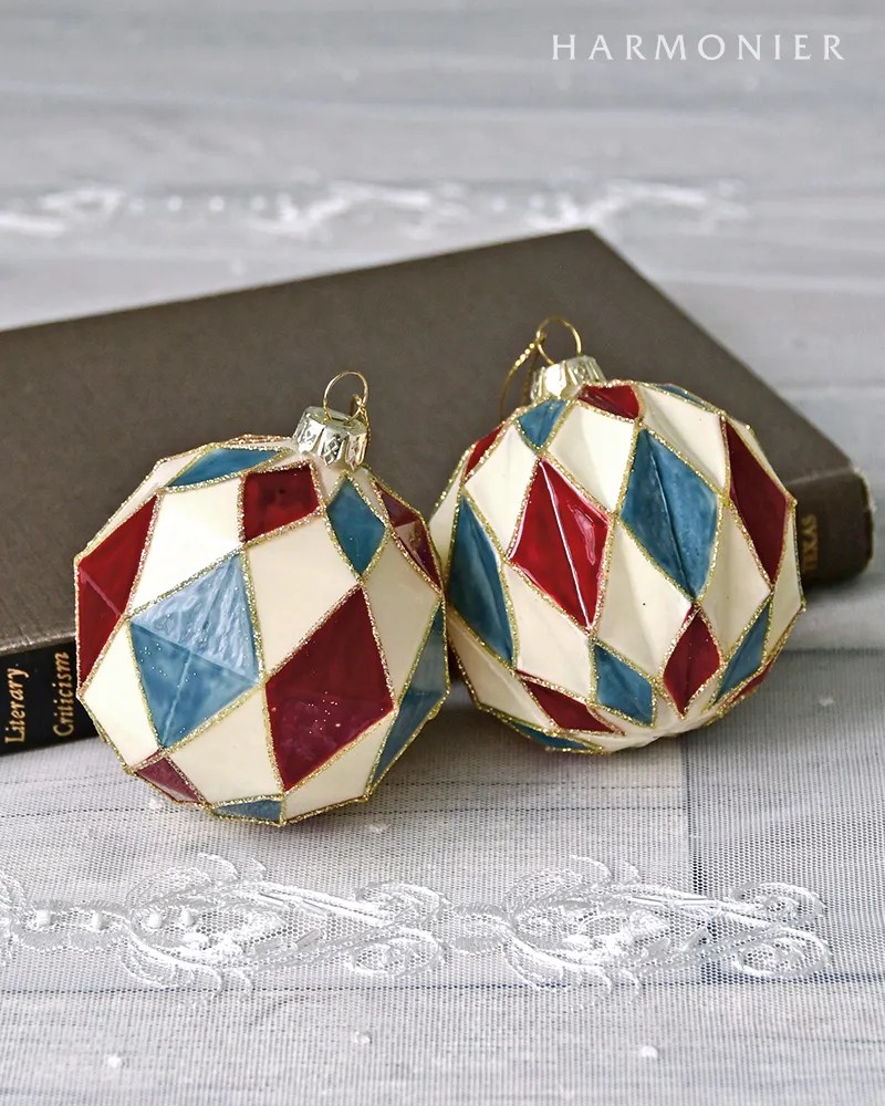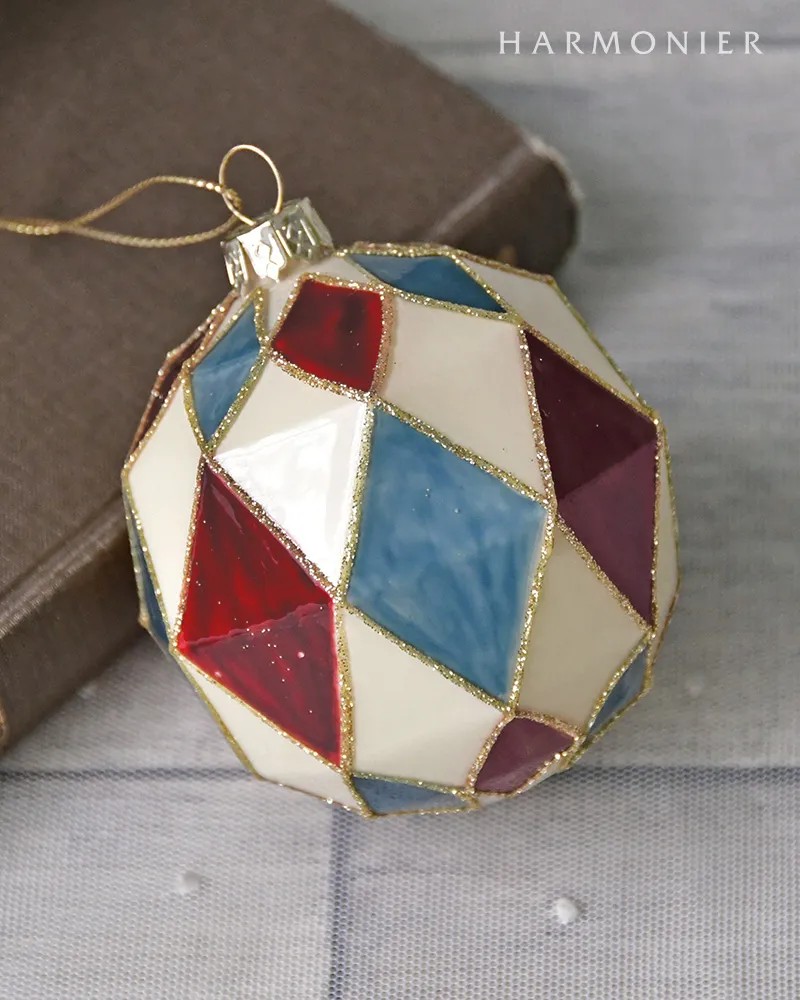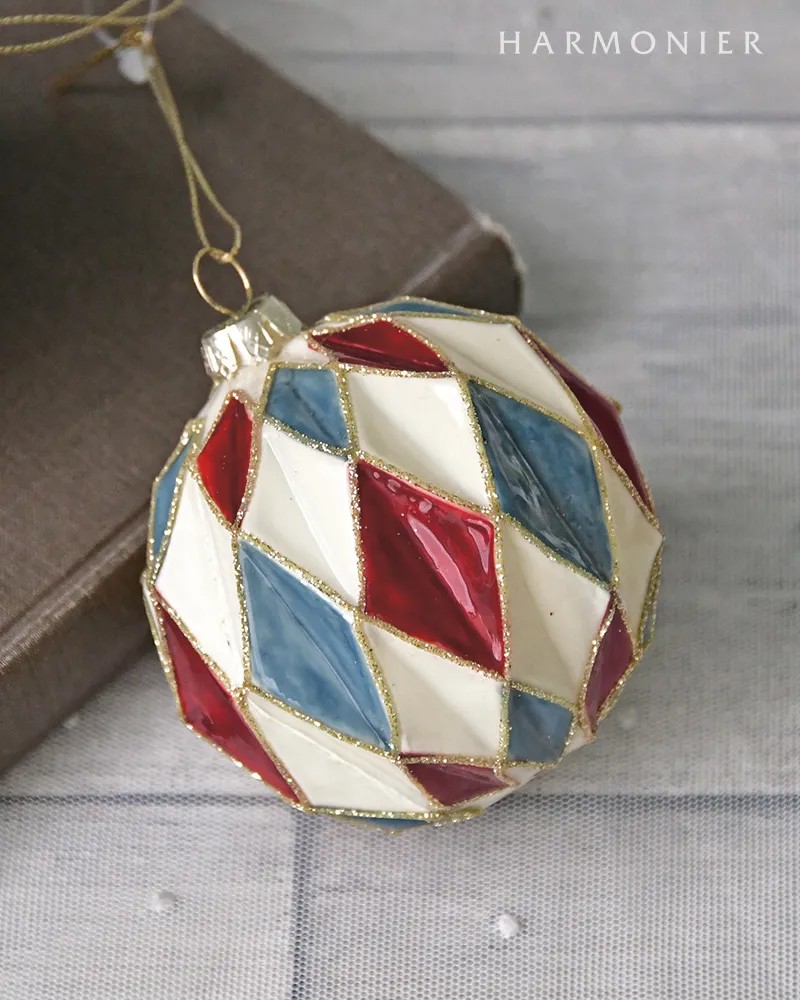 ダイヤチェック柄を描いたガラス製のクリスマスオーナメント
