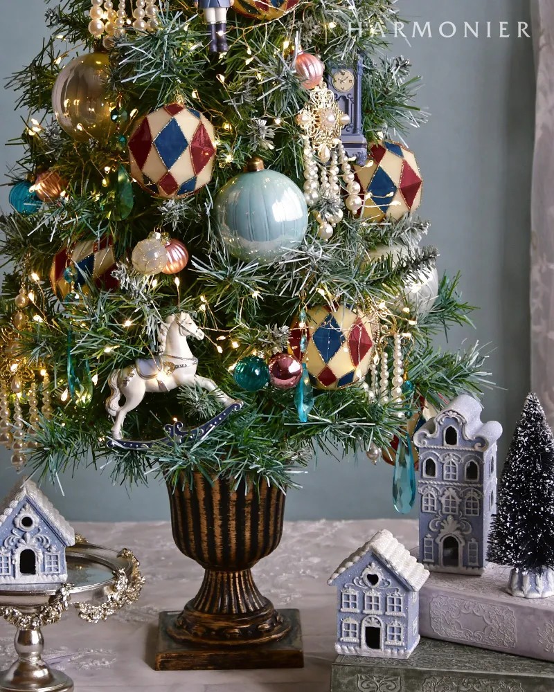 おしゃれなくすみカラーのダイヤチェック柄を描いたガラス製のクリスマスオーナメント。アンティーク調のデザインで、動物モチーフやナッツクラッカーなどのオーナメントとコーディネートして飾ると、賑やかでかわいいクリスマスツリーの装飾になります。90cm~150cm程度のクリスマスツリーの装飾に最適なサイズのオーナメントです。