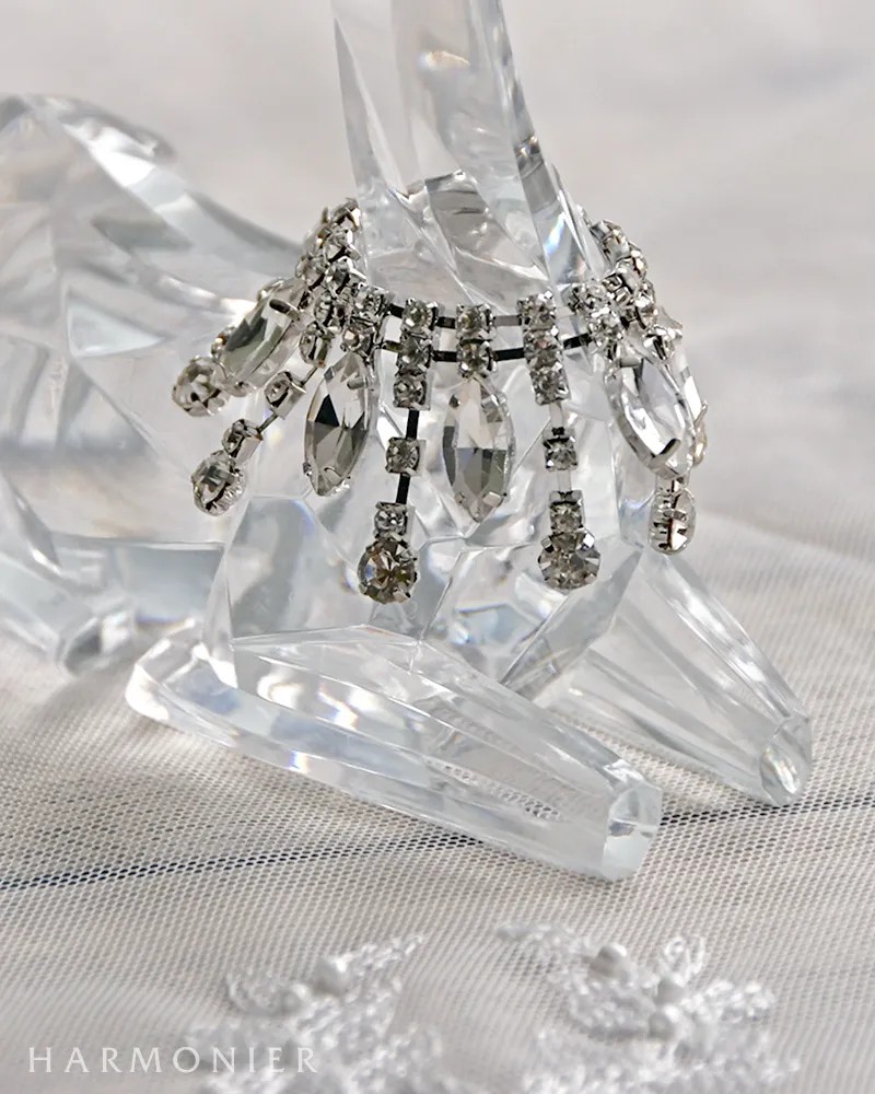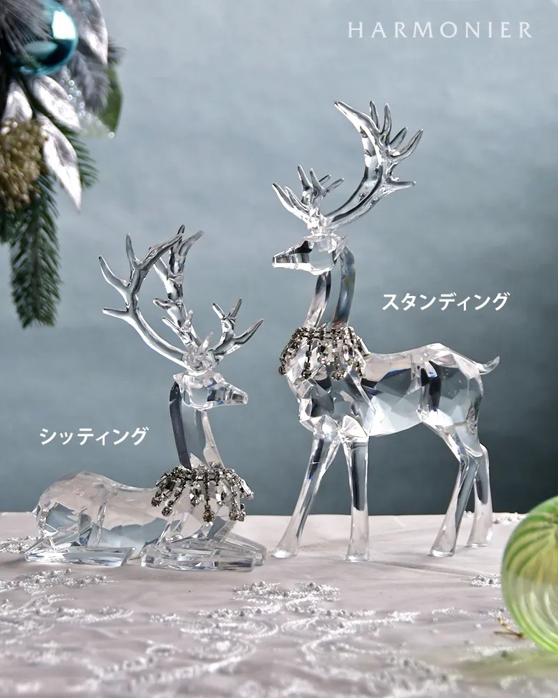 まるでガラスの彫刻のように美しいトナカイのオブジェ。首元にはラインストーンのネックレスを付けたラグジュアリなデザイン。スタイリッシュなフォルムで高級感のある印象です。セットで飾ると存在感があり、モダンなインテリアにもクラシカルなお部屋にもおすすめです。