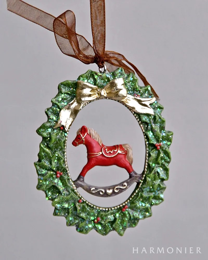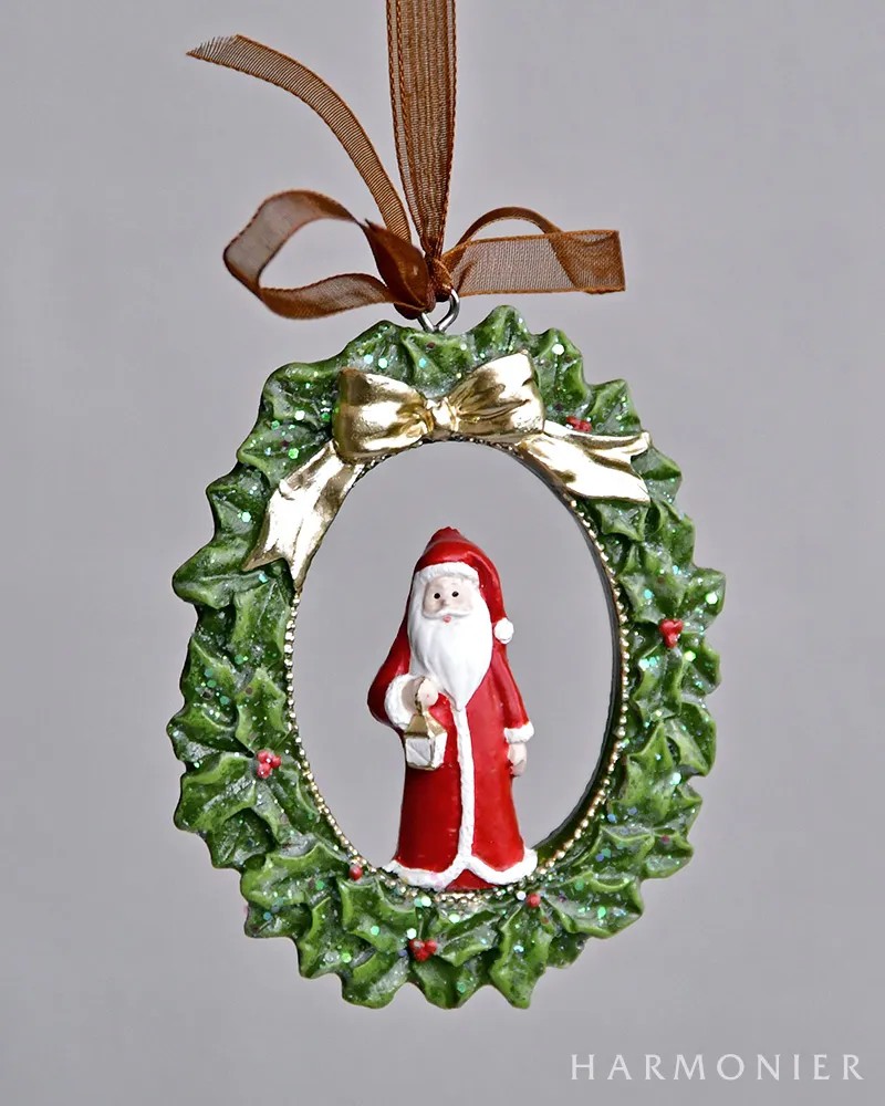 サンタクロースとロッキングホースが入ったミニリースのオーナメントセット。落ち着いたトーンのクリスマスカラーで、トラディショナルなツリーを飾りたい方におすすめです。壁面に飾ってもかわいいです。プレゼントに添えても喜ばれますよ。60cm~120cm程度のクリスマスツリーの装飾に最適なサイズです。