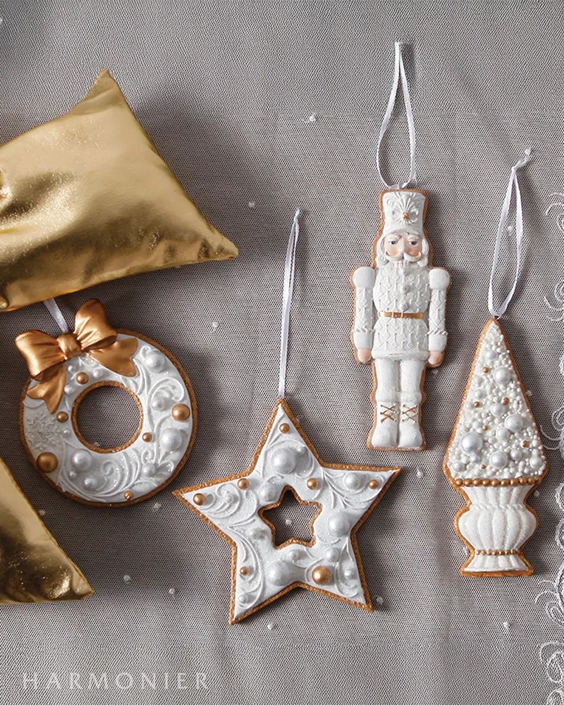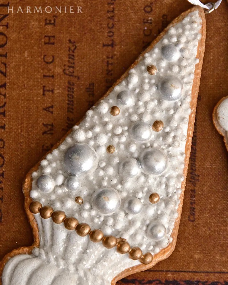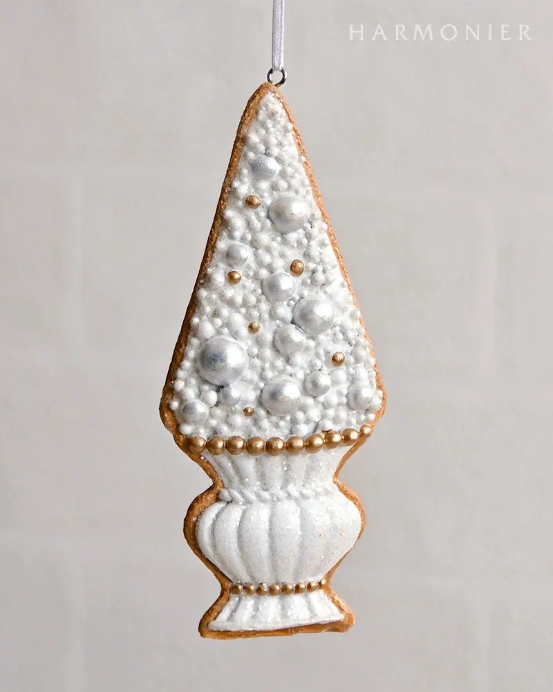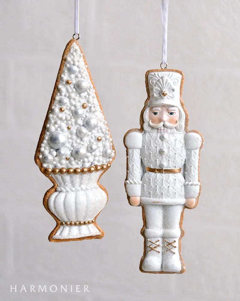 アイシングクッキーのようなデザインのおしゃれなオーナメント。ホワイトとゴールドのコンビネーションが華やかで、クリスマスツリーによく映えます。オーソドックスなモチーフながら、細部までデザイン性の高いオーナメントで、高級感のある印象です。120cm以上のクリスマスツリーに最適なサイズです。