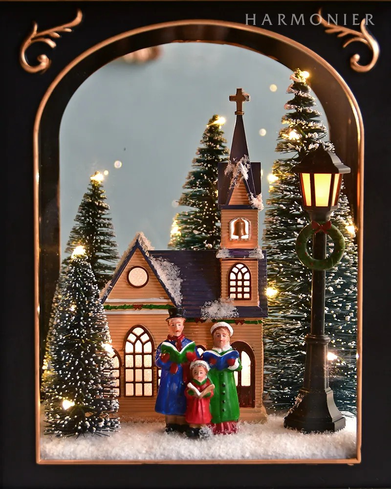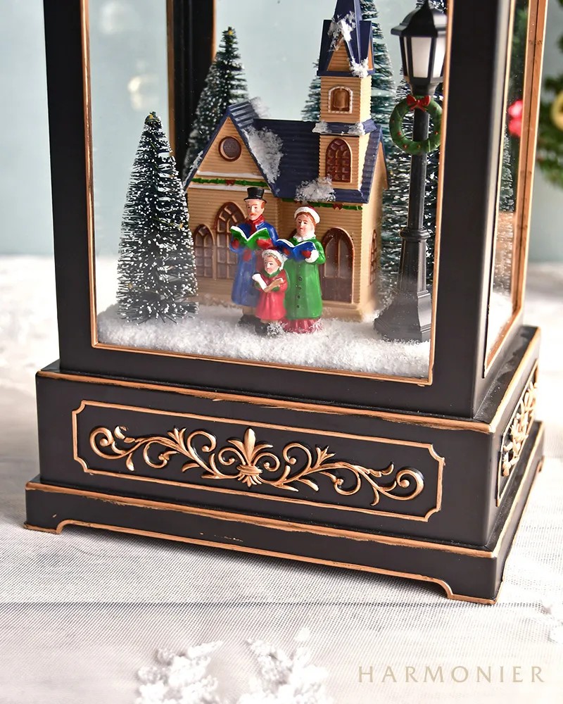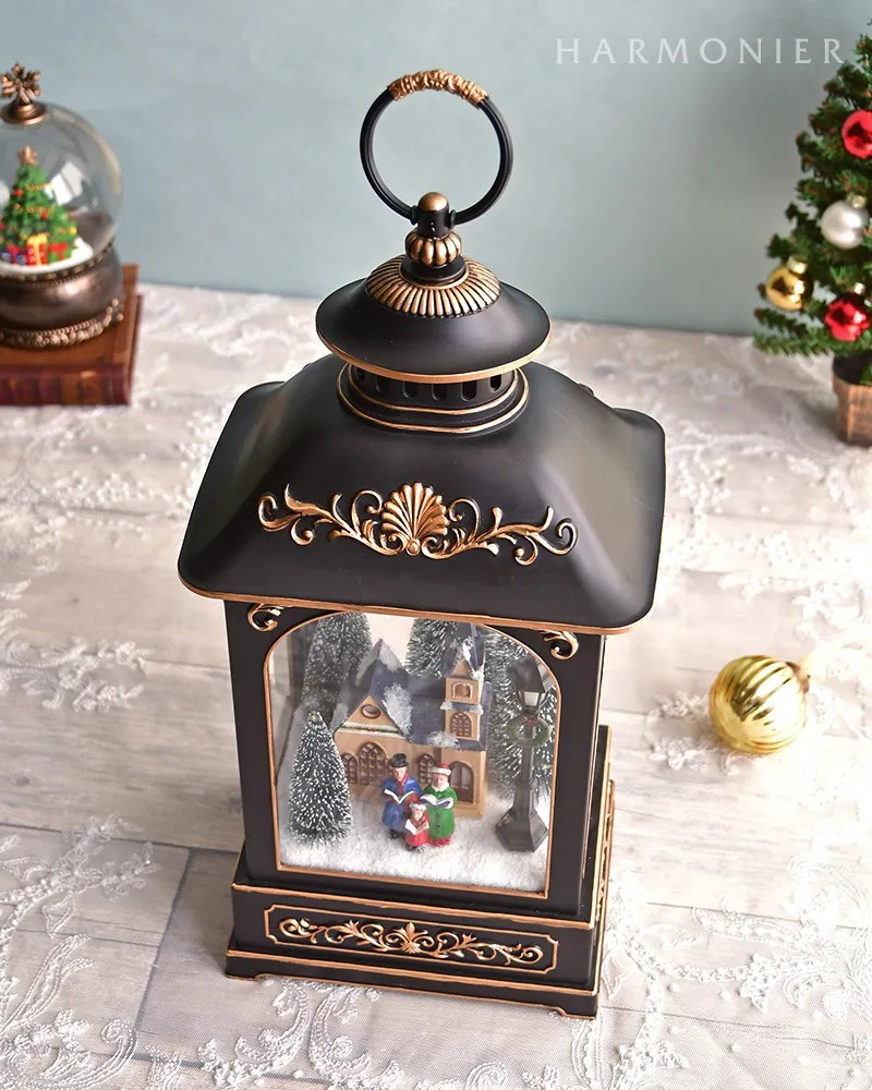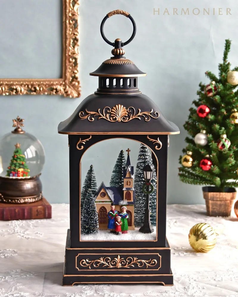 クラシカルな教会が入ったランタンのオブジェ。スイッチを入れるとLEDライトが点灯し、「きよしこの夜」の音楽が流れます。教会の前には賛美歌を歌う家族の姿。クリスマスの厳かで美しいワンシーンを再現したオブジェは、クラシカルなお部屋のクリスマスデコレーションに最適です。場所に合わせて電池かUSB接続で使うことができます。