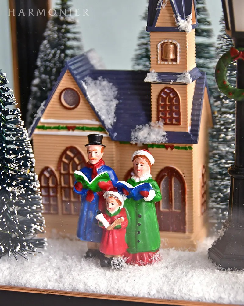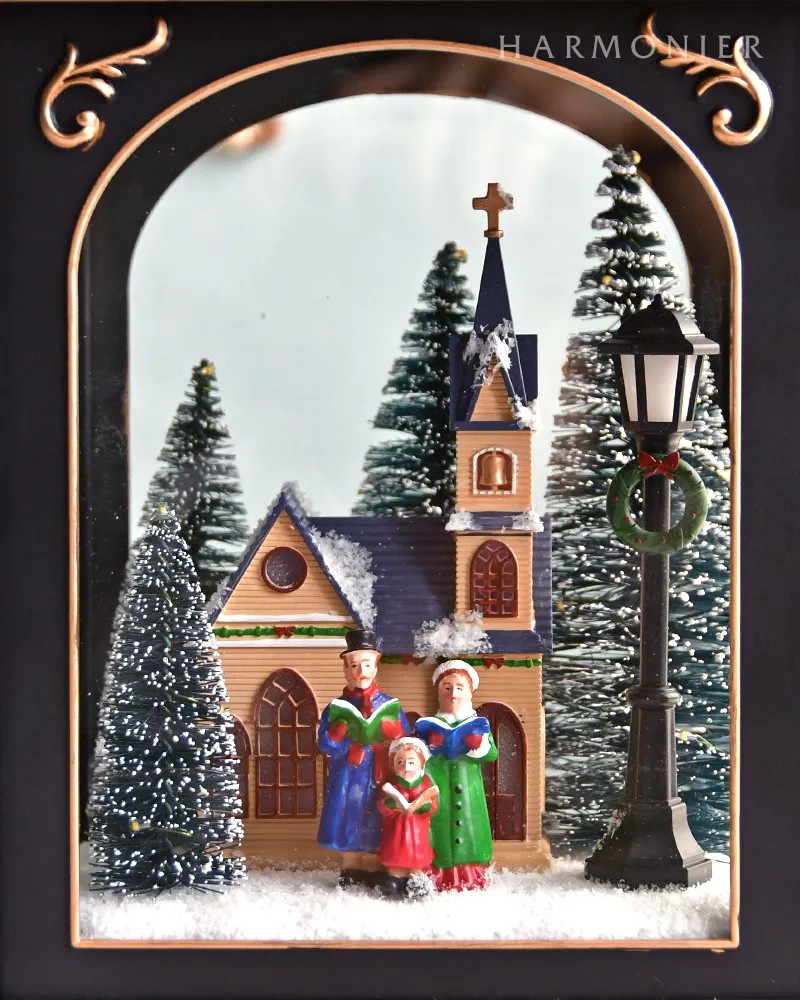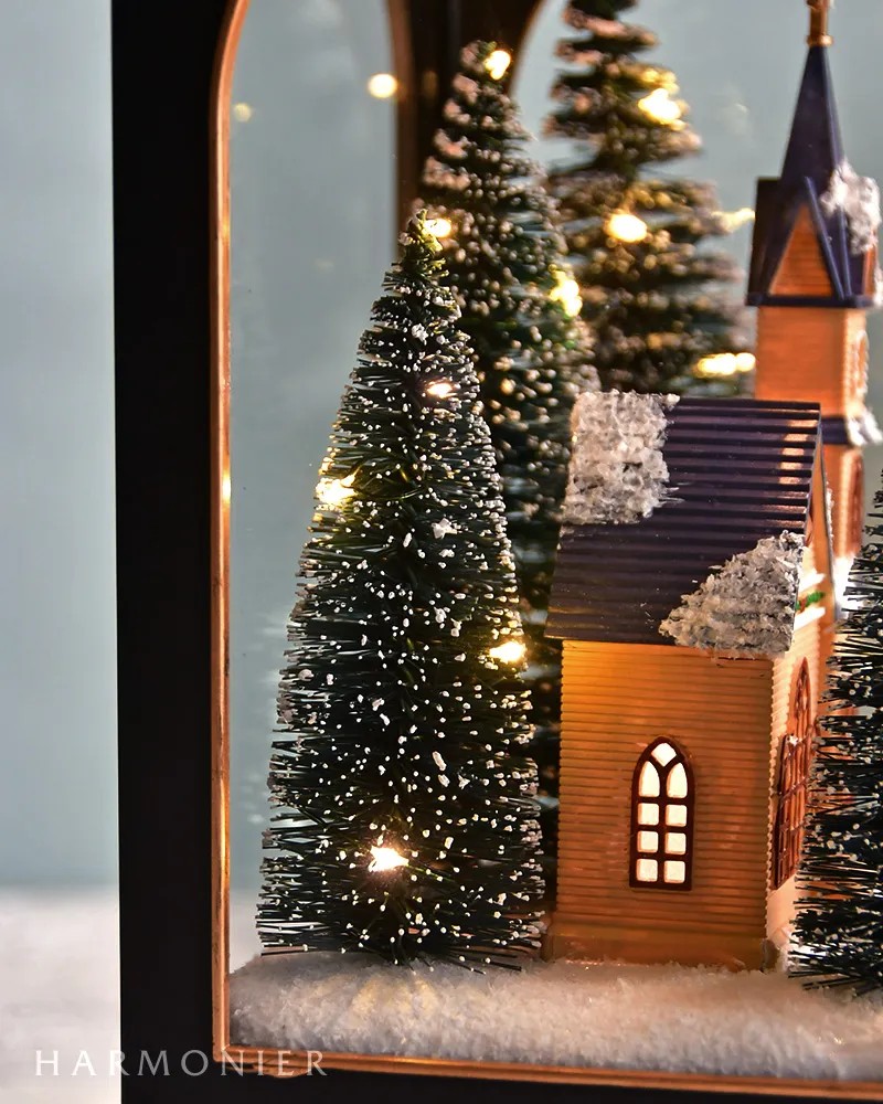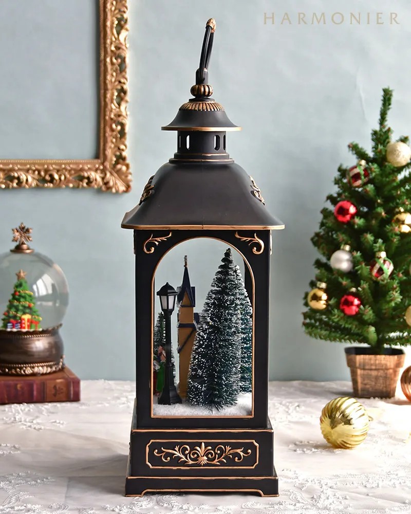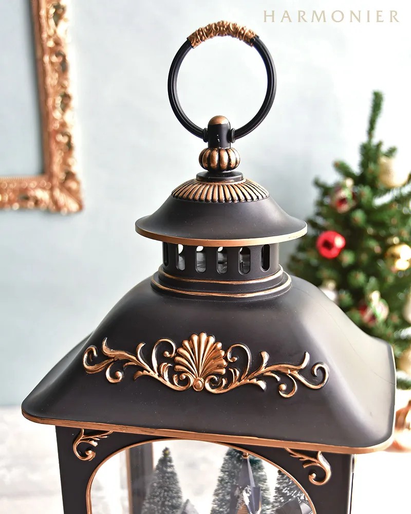 クラシカルな教会が入ったランタンのオブジェ。スイッチを入れるとLEDライトが点灯し、「きよしこの夜」の音楽が流れます。教会の前には賛美歌を歌う家族の姿。クリスマスの厳かで美しいワンシーンを再現したオブジェは、クラシカルなお部屋のクリスマスデコレーションに最適です。場所に合わせて電池かUSB接続で使うことができます。