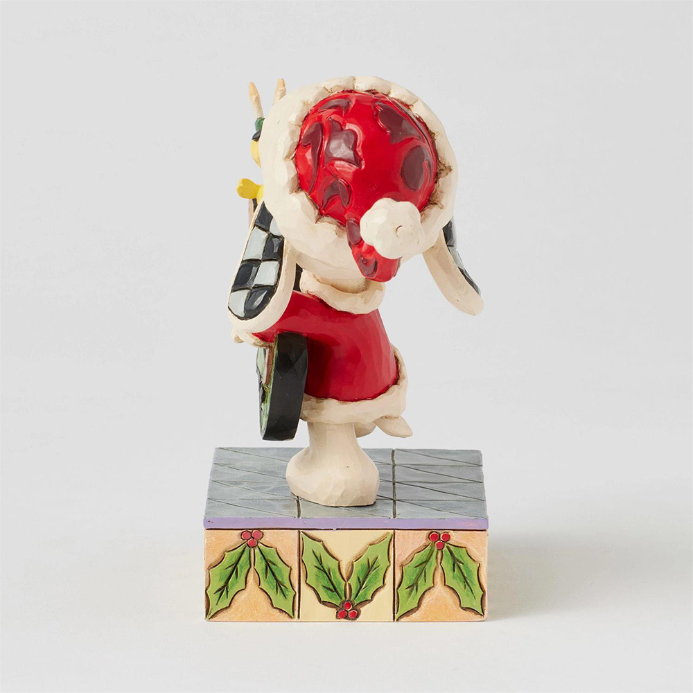 スヌーピーはサンタクロースの格好で、ウッドストックはトナカイのツノを付けてクリスマスを楽しんでいます。