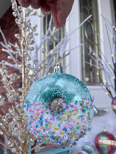 ライトブルーの色合いが可愛らしいドーナツ型のデザインで、ツリーや棚を明るくポップに彩ります。