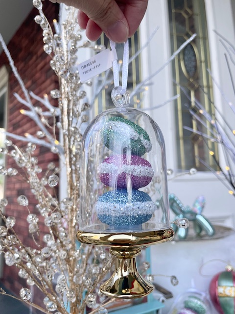 ケーキケースの中に入ったマカロンのデザインが、ツリーや棚を華やかに彩ります。