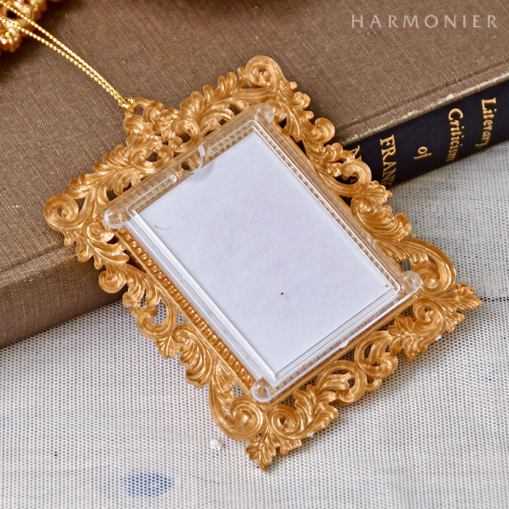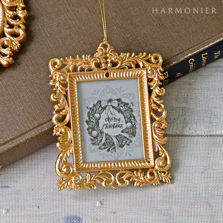 クラシカルなフレームにクリスマスのイラストが入ったコンパクトなクリスマスツリーオーナメント。中の絵は入れ替え可能で、家族の写真や切り抜きなどを入れられます。軽くて扱いやすい素材で、クリスマスツリーの装飾にはもちろん、壁面に並べて飾ってもかわいいです。120cm程度までのクリスマスツリーの装飾に最適なサイズのオーナメントです。