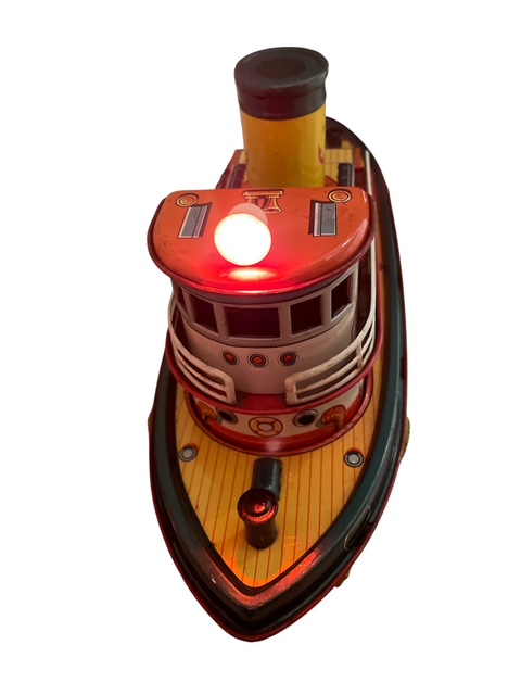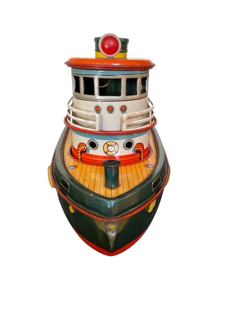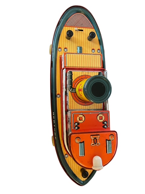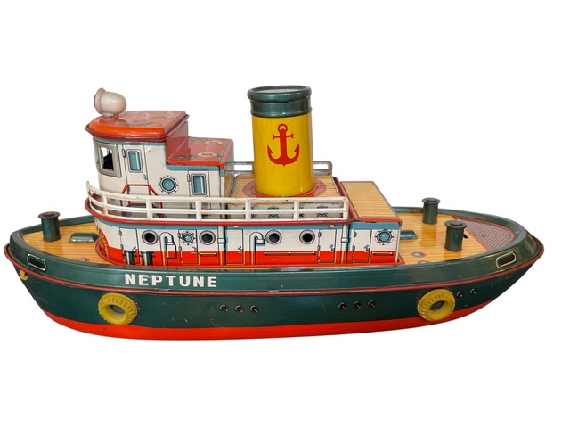 1960年代に製造された増田屋(モダントイズ)のタグボート「NEPTUNE」グリーンとオレンジ色のボディに浮き輪や煙突、扉などが描かれています。